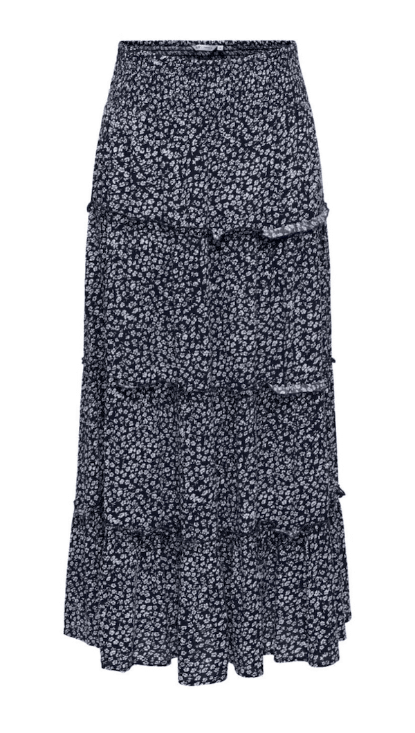 Beskrivelse: ONLFERNANDA LIFE LAYERED LONG SKIRT i farven Night Sky er en feminin og let nederdel med et elegant, flydende udtryk. Den mørkeblå bund kombineret med et fint print giver et klassisk og tidløst look, som nemt kan styles til både hverdag og mere pæne anledninger.