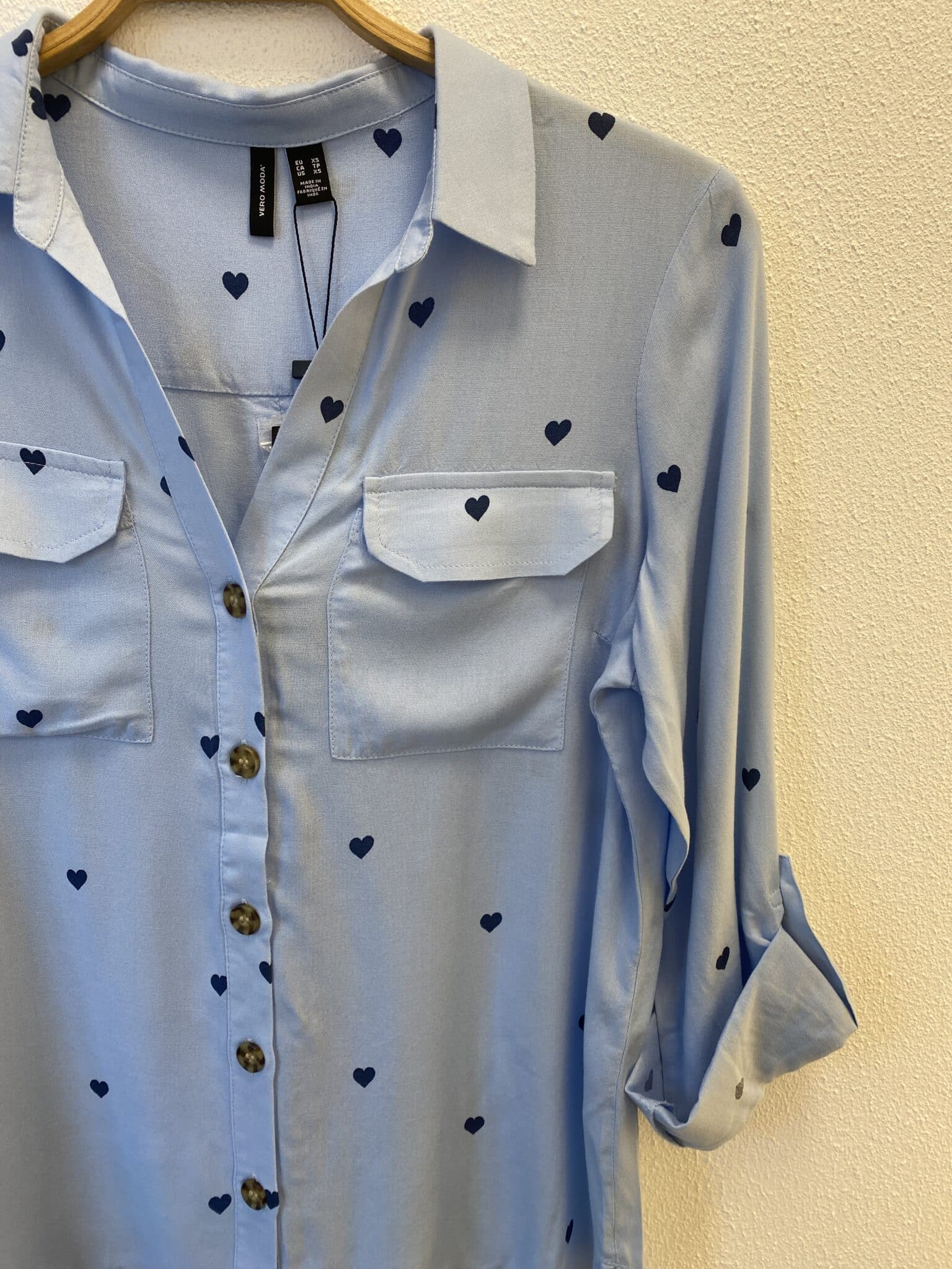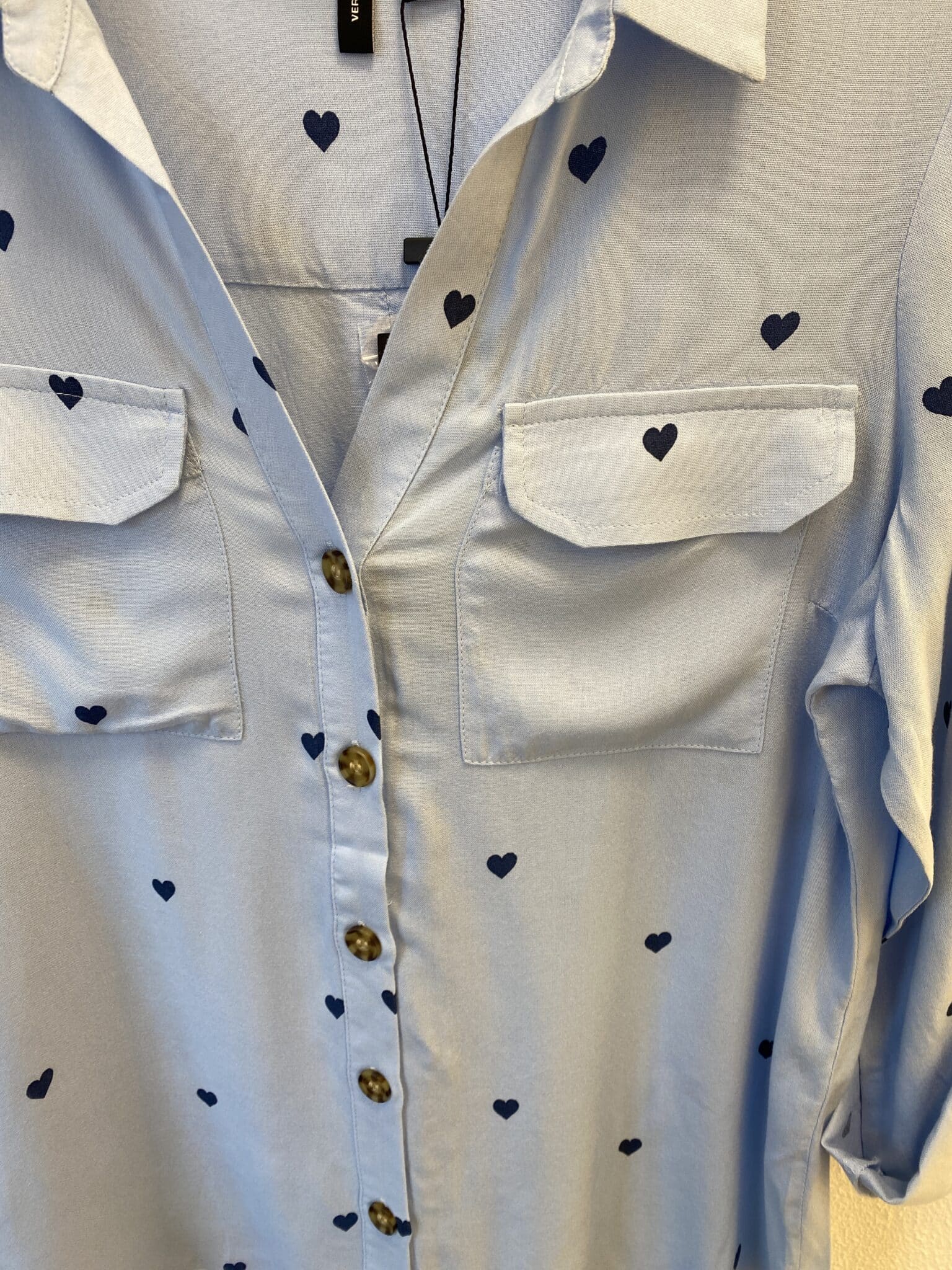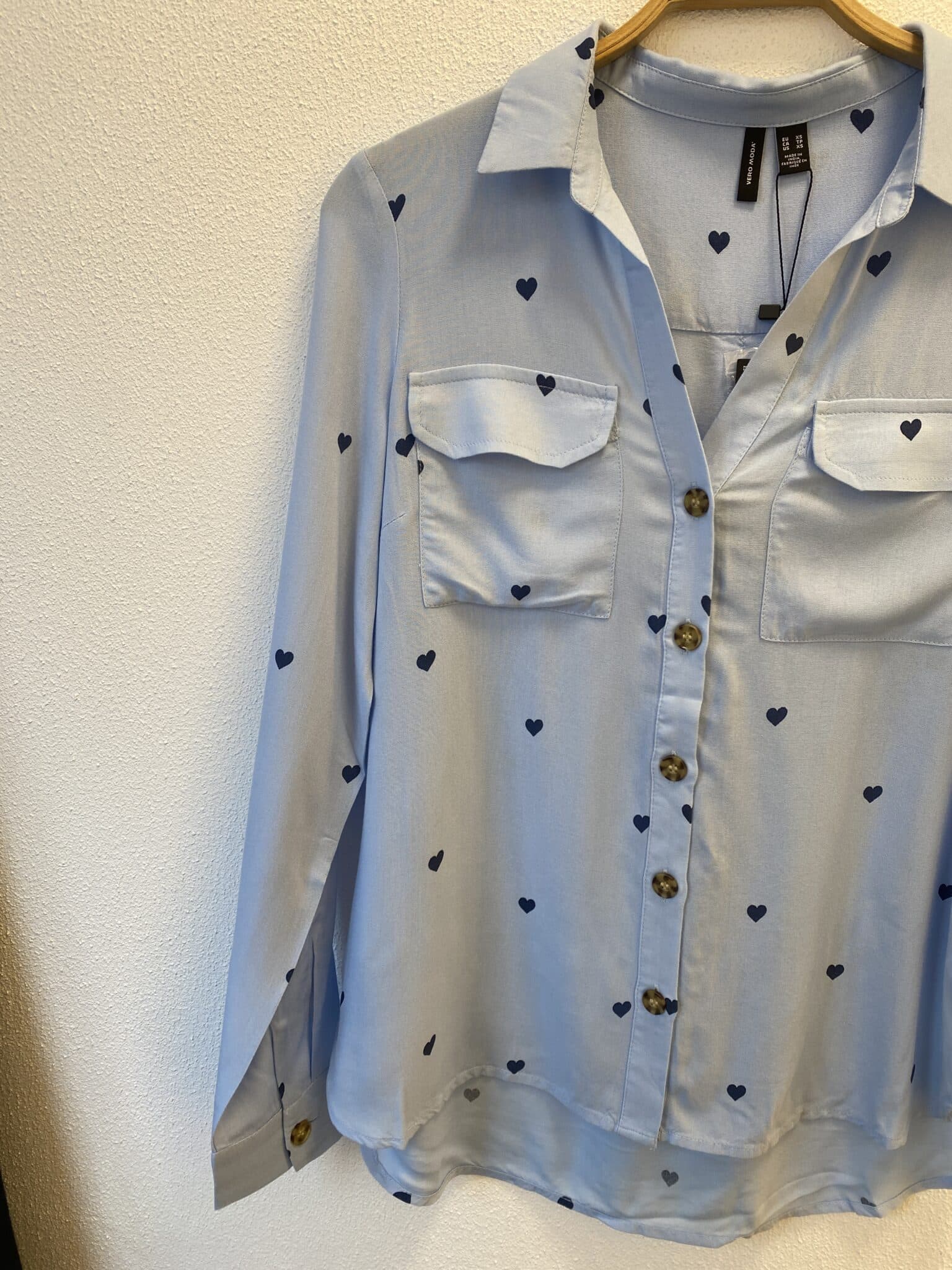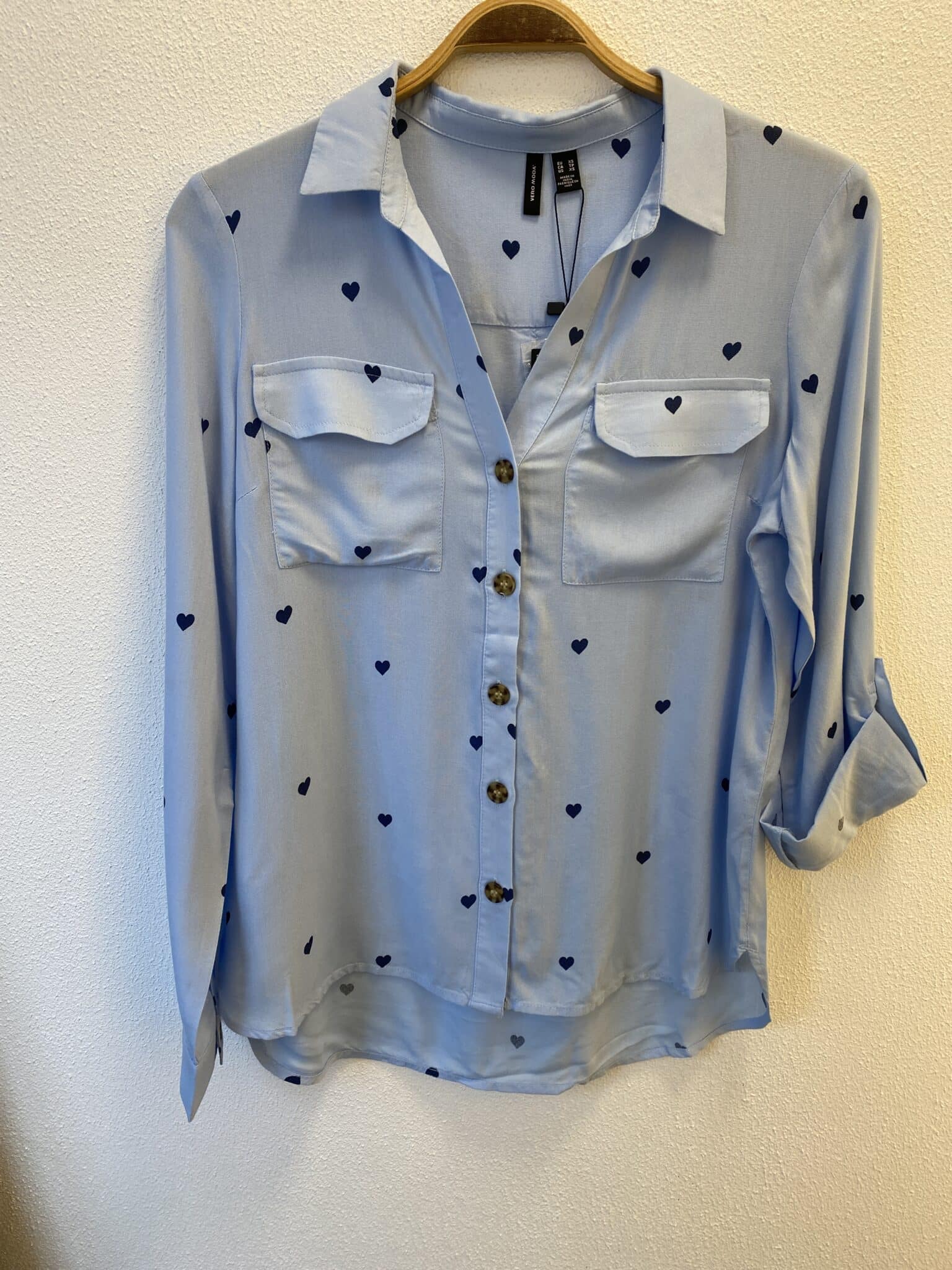 VMBUMPY L/S Shirt NEW WVN NOOS i farven Cashmere Blue/Dark Denim Heart er en langærmet skjorte med et stilfuldt hjerteprint, der tilføjer et feminint og unikt touch. Skjorten har et tidløst snit med knaplukning, klassisk krave og en afslappet pasform, hvilket gør den nem at style både til hverdag og mere afslappede looks. Et alsidigt og komfortabelt valg til basisgarderoben.